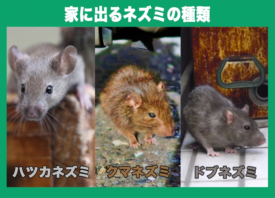 | 侵入口 | 下水道管・便器・床下通気口・など | 床下通気口・軒下・屋根の隙間・エアコンダクト穴・など | 床下通気口・電気配線の穴・屋根の隙間・エアコンダクト穴・壁の亀裂・など |