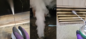 ネズミが人間の気配を察知すると即座に隠れてしまいます。これらのネズミを一匹づつ捕獲するのは大変な作業になりますので忌避剤を散布して一斉に家の外に退散してもらう手法が最も安価で効率的です。こちらの被害宅では煙タイプの忌避剤を使用しました。煙は下から上に向かってにげるため、必要箇所で焚けば壁の中や狭い隙間に入り込んでいるネズミを追い払うことができます。