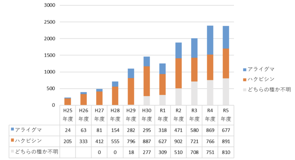 東京都町田市が実施している「アライグマ・ハクビシン防除事業」の公開データを見ると、市内での捕獲・相談が年々増加していることが公式に確認されています。