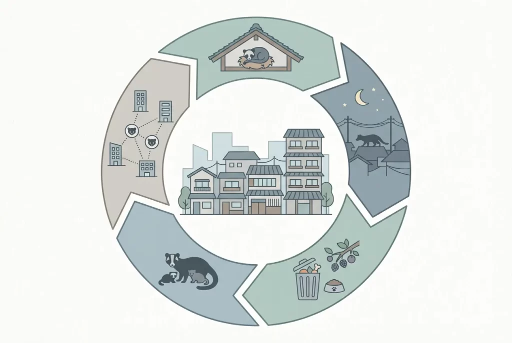 餌(生ゴミ・果樹)、隠れ場所(屋根裏・床下)、天敵の少なさが重なり、東京はハクビシンが定着しやすい環境になっています。