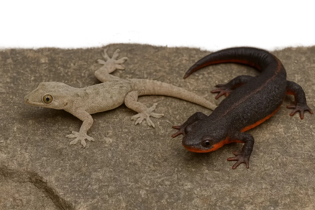 一方のイモリは、サンショウウオの仲間である両生類。日本では「アカハライモリ」が代表的で、黒っぽい体に鮮やかな赤いお腹を持っています。皮膚はツルツルしており、ヤモリとは見た目でも大きな違いがあります。