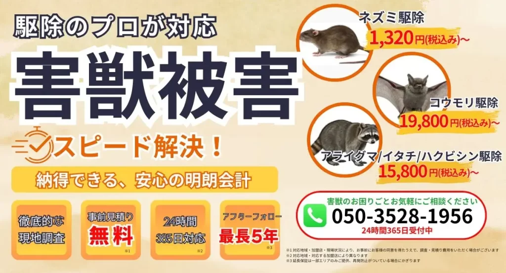 専門知識を持つスタッフが、ネズミからハクビシン・イタチまで、家屋に侵入した害獣を徹底的に駆除・防除します。