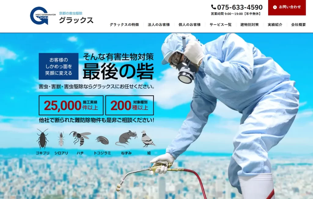 グラックスは、関西エリアに密着したネズミ駆除業者で、現地調査を重視した提案が特徴です。被害状況や建物の構造を細かく確認したうえで対策を行うため、柔軟な対応が期待できます。