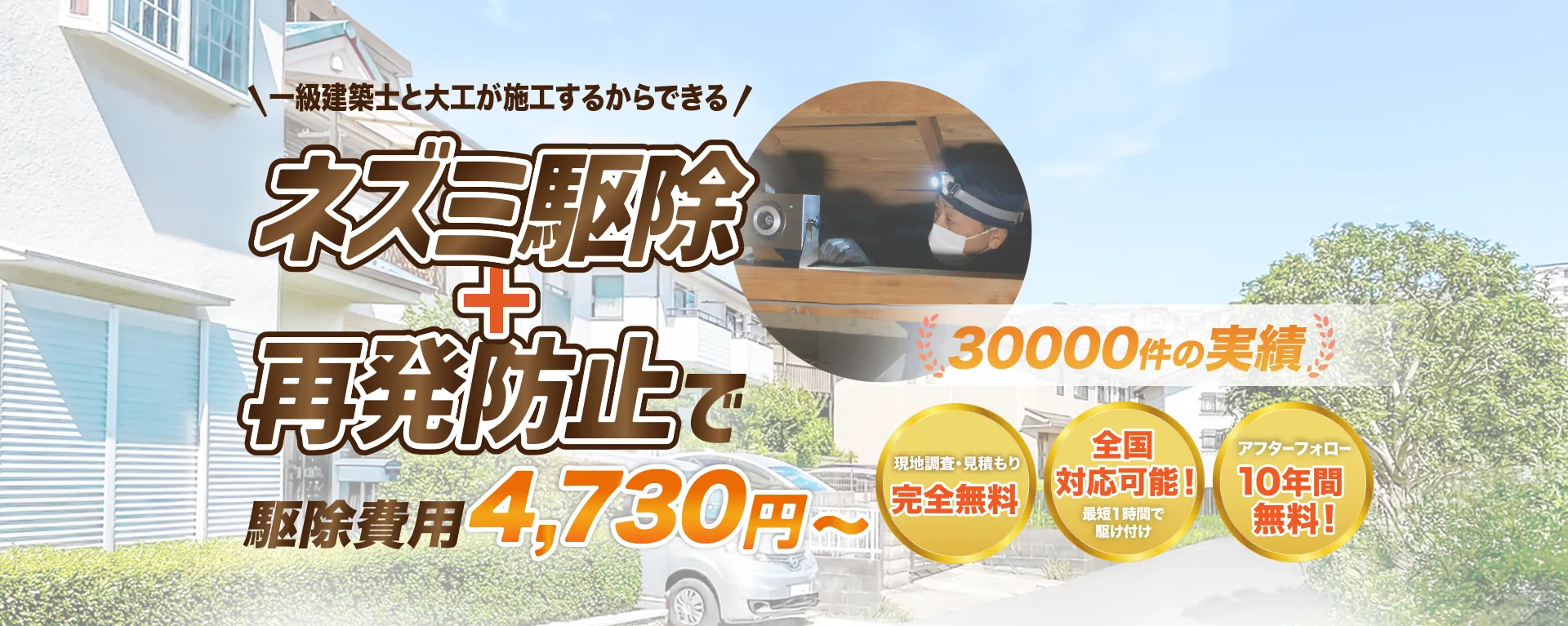建築のプロとネズミ駆除のプロだからこそできる、他社では実現できないネズミ再発防止の施工を行います。