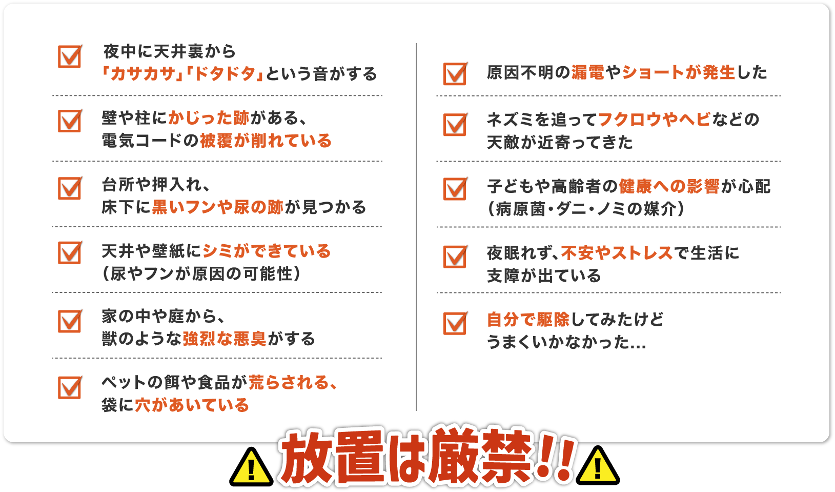 放置しておくとネズミが持つ汚いウイルスによる感染症などにかかってしまったり、電気線をかじられて火災を起こし、 大事な家族や家までも危険に晒すことになります。
